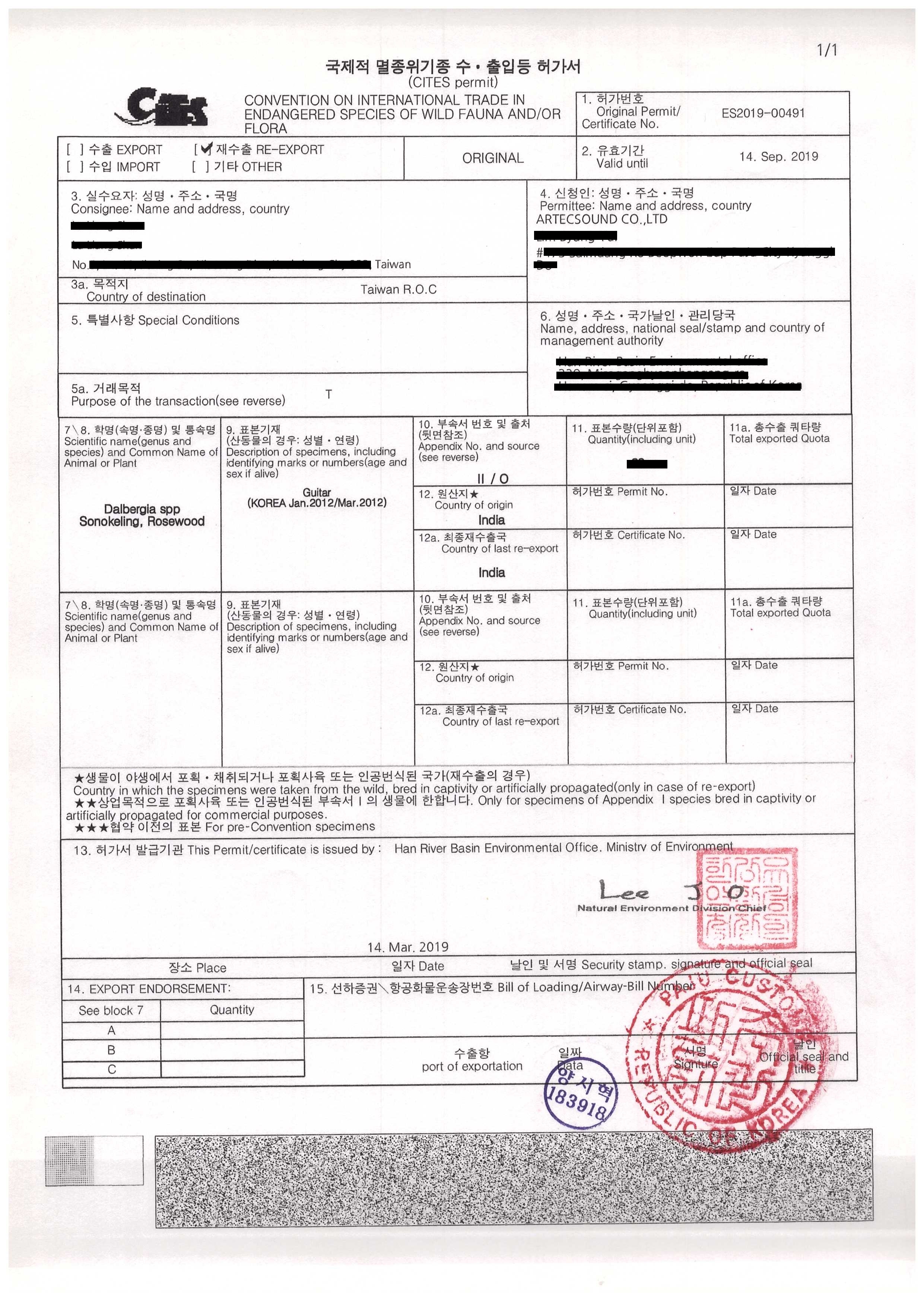 這是今年5月初我們進口Andrew White時的CITES文件。為了這個文件在申請與海關查驗的時間就卡了一個月之久,更何況是進出口更加頻繁的吉他大廠。